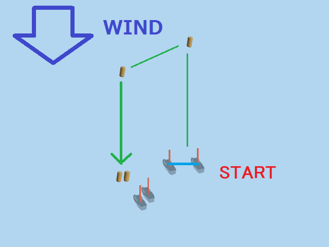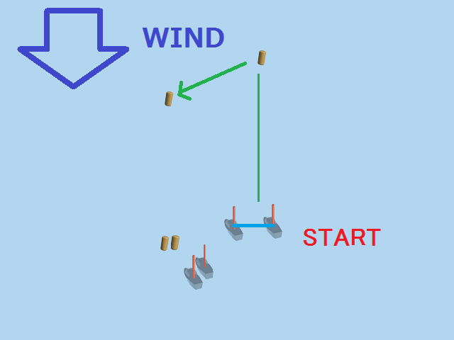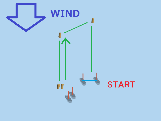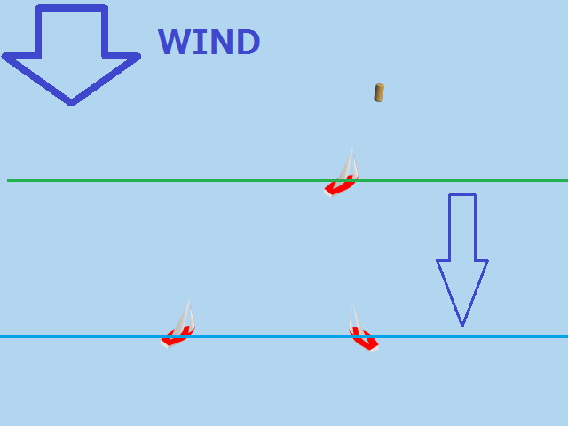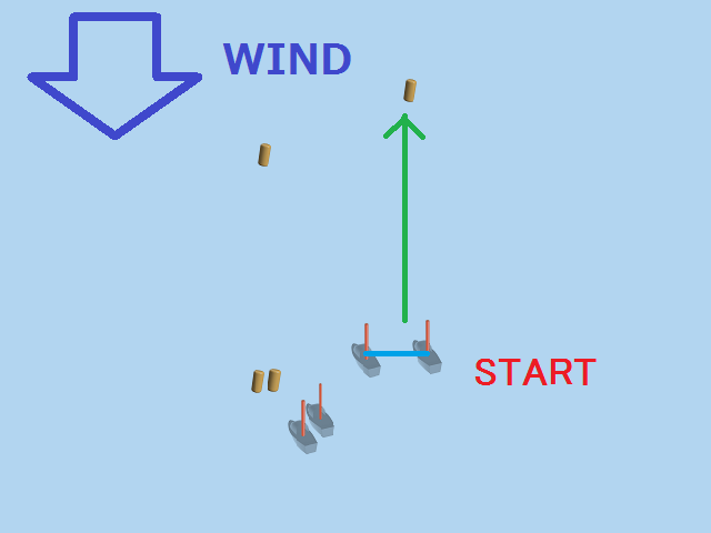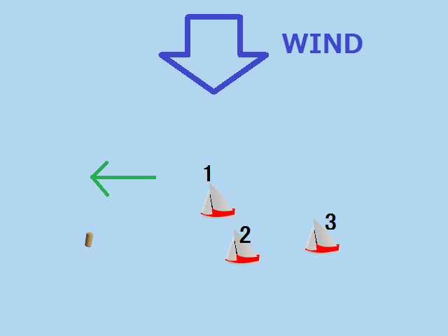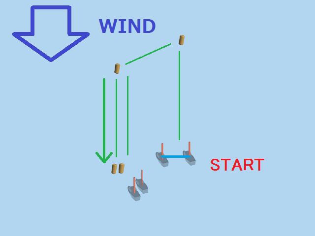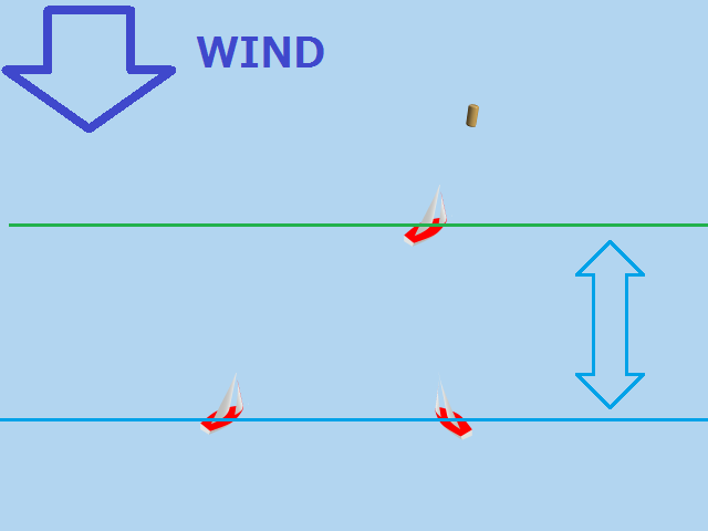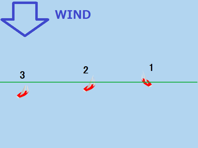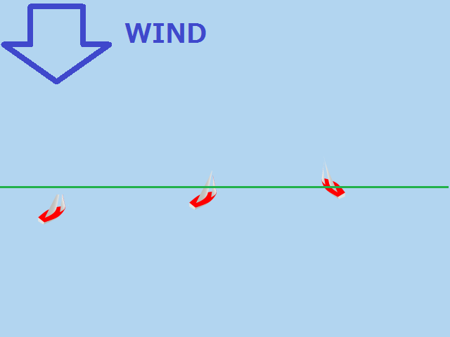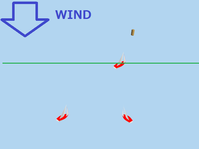 実際のレース画面で、風向垂直線が引かれているのは、その線上にいる船はトップ艇ですよ。 ということを表していると同時に、風向がどちらの方向かも表しているのです。 (もちろん、海上に線が引かれているわけではなく、仮想的な線です)