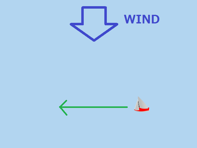 upwind(アップウインド)の走りでは、ヨットは風の吹いてくる方向に対して斜め前にしか進めません。